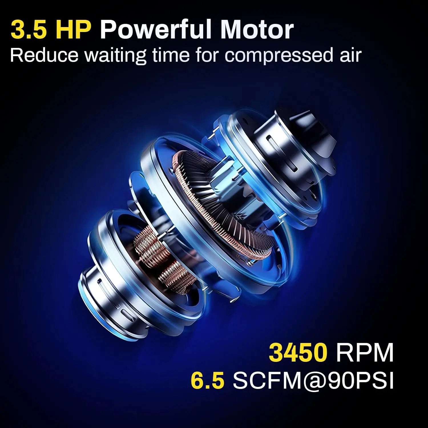 - Powerful Engine & High Performance: Equipped with a 3.5 HP motor and industrial air filter, this 10 gallon air compressor delivers a maximum working pressure of 115 PSI and an airflow rate of 6.5 CFM, enhancing work efficiency and supporting dual outlets for simultaneous use