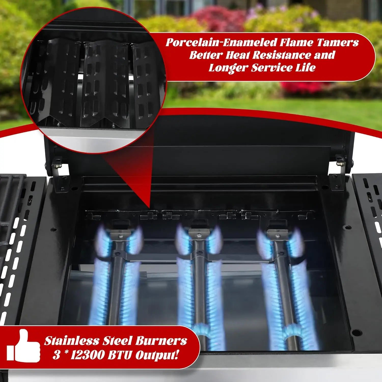4. Powerful Cooking Output: Equipped with three main burners (12,300 BTU each), this grill ensures fast, even heating for perfectly grilled meals. The performance ensures consistent heat across the entire cooking surface, so every bite is cooked to perfection.