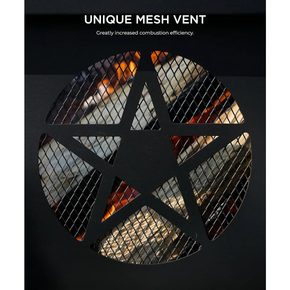 - 【'S ELEGANT DESIGN】The pentagram geometric cut-out design on the side of the wood-burning fire pit captures firelight to produce whimsical shadows. The drilled design maintains the flames strong and encourages airflow. All elegant designs of the fire pits for outside are dedicated to the warmth and comfort for you.
