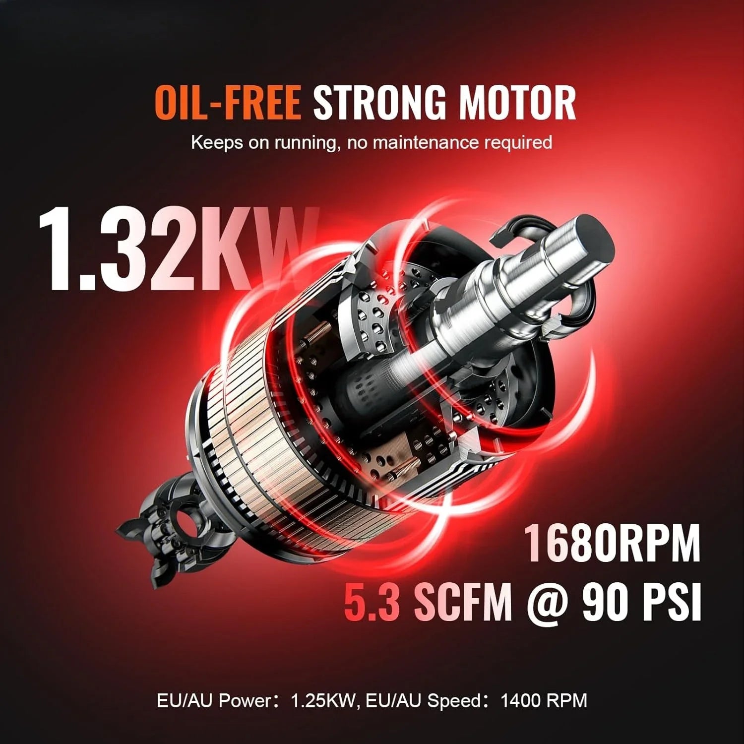 - 10 Gallon Air Compressor: Our 1.32KW oil-free motor drives the compressor up to a speed of 1680 r/min and 5.3 CFM@ 90 PSI air delivery. It is ideal for supporting a variety of pneumatic and air tools, such as nail gun, impact wrench, spray gun, pneumatic screwdriver, best for tire inflation, auto repair, spray painting, woodwork nailing, etc.