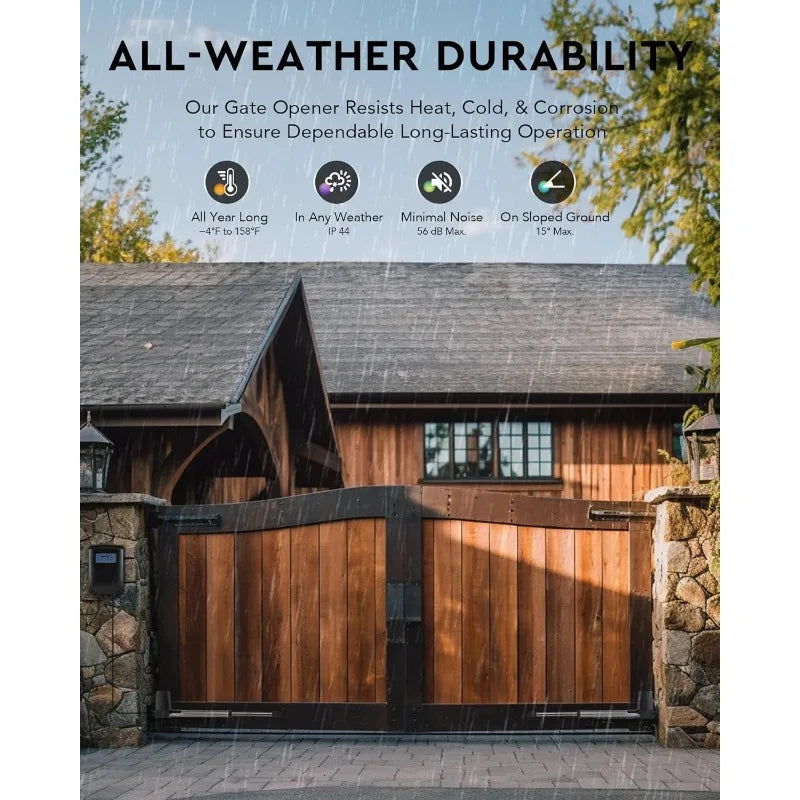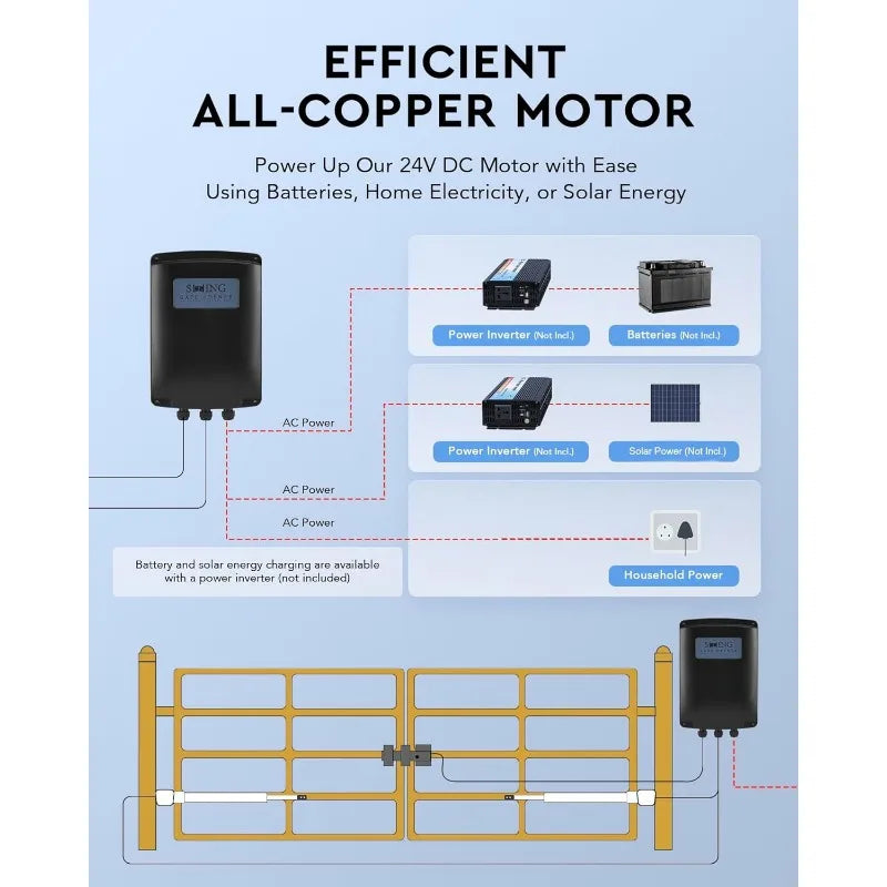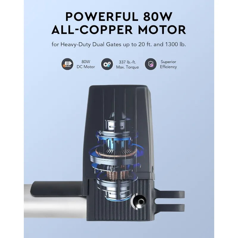 Open Dual Gates with Ease: With its energy-efficient 80W motors, this automatic swing gate opener kit from smoothly opens driveway gates, villa gates, garage gates, or farm gates up to 1300 lb and 20 ft at 1 inch per second.