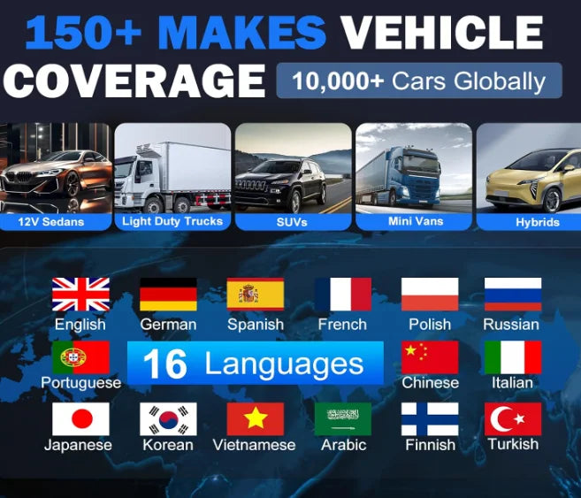 VDIATOOL VD70 supports 150+MAKES cars in the global market, covering over 10,000 cars,Which is specially customized for large Maintenance Shops, Workshops, Car Dealers, Auto Mechanic. Work for 12V Petrol Sedans, SUVs, Minivans and Light-Duty Trucks across the globe, including: