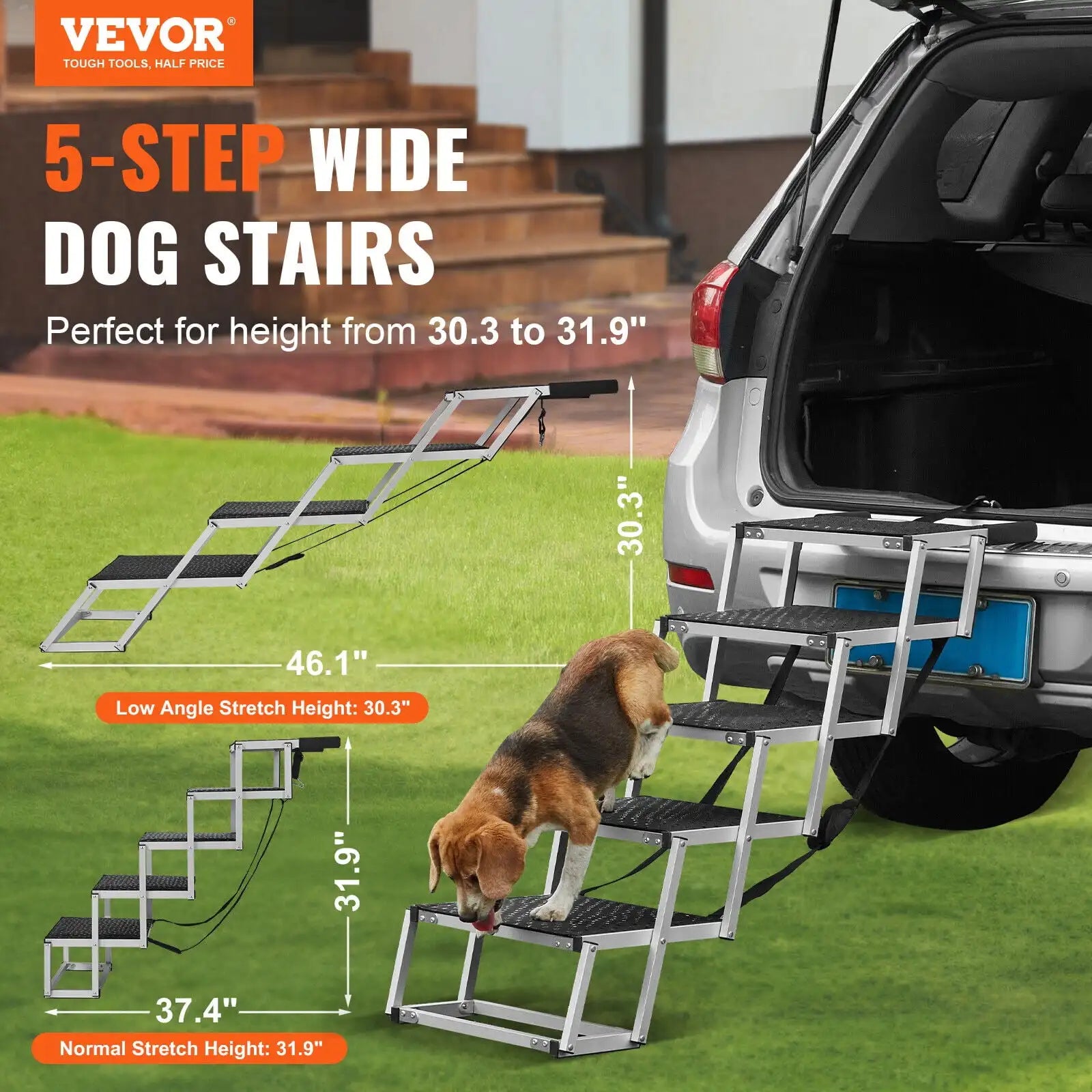 Convenient Pet Access: The 5-step dog stair for cars adjusts in height between 30.3-31.9'in, making it ideal for small dogs, elderly pets, or injured pets to easily access car trunks, side doors, SUVs, small vans, trucks, beds, sofas, grooming or vet tables.