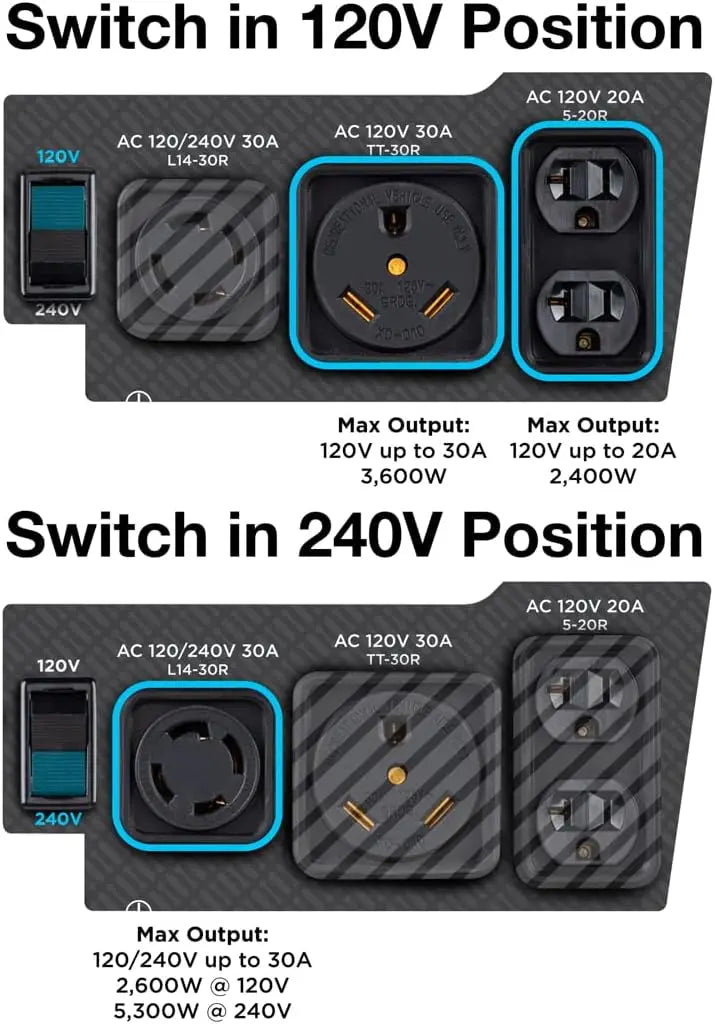 - Features One 5–20R 120V Household Duplex Receptacle, One RV-Ready TT-30R 30 Amp Receptacle, and One Transfer Switch Ready L14-30R 30 Amp Receptacle; All Outlets Have Rubber Covers for Added Safety