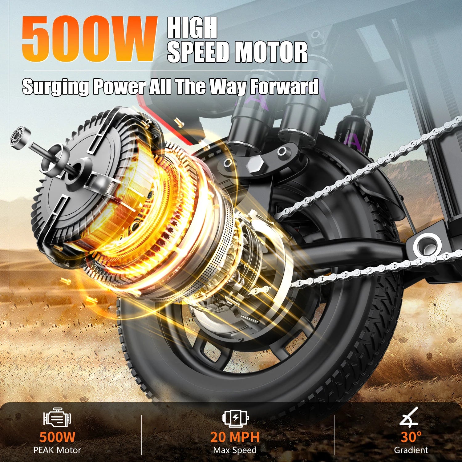 [𝙁𝙤𝙡𝙙𝙖𝙗𝙡𝙚 𝘿𝙚𝙨𝙞𝙜𝙣 & 𝙍𝙚𝙢𝙤𝙫𝙖𝙗𝙡𝙚 𝘽𝙖𝙩𝙩𝙚𝙧𝙮]This electric bicycle for adults can be folded easily,the fold size is 26.7"x17" x26.3", so it's can be folded and stored in a car trunk or easily transported on the subway, which is an ideal choice for commuting and exploring.Its removable battery makes you charge it more convenient whether you charge it in home or your office