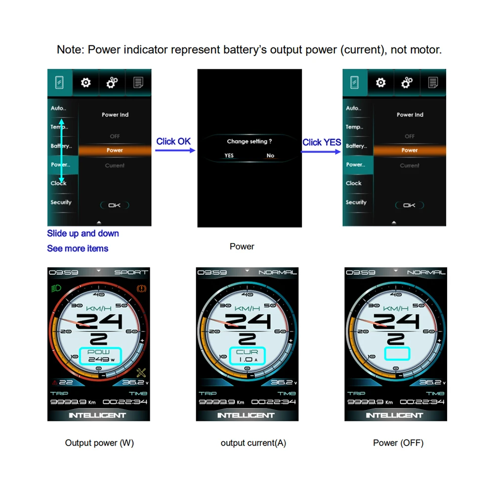 Mileage indicator:Odometer, Trip distance, Range (if controller support)