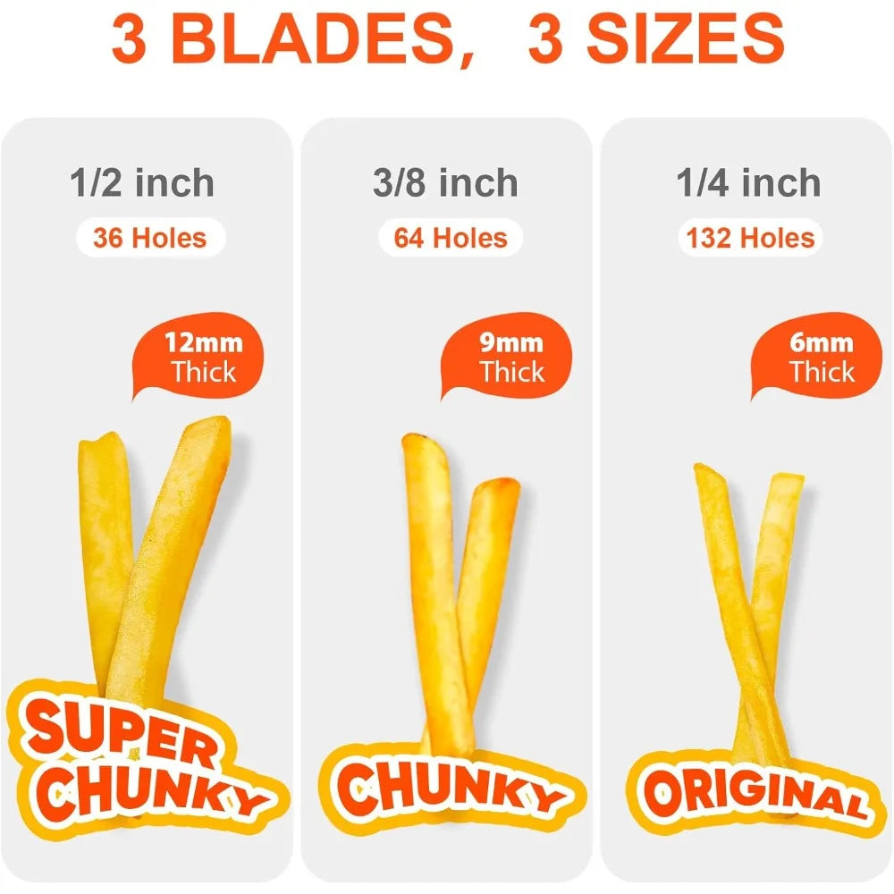 3 Sizes Blades: Make 1/2" thick, 3/8" and 1/4'' thin evenly cut french fries in your home! Changing blades in seconds by just loosening two screws