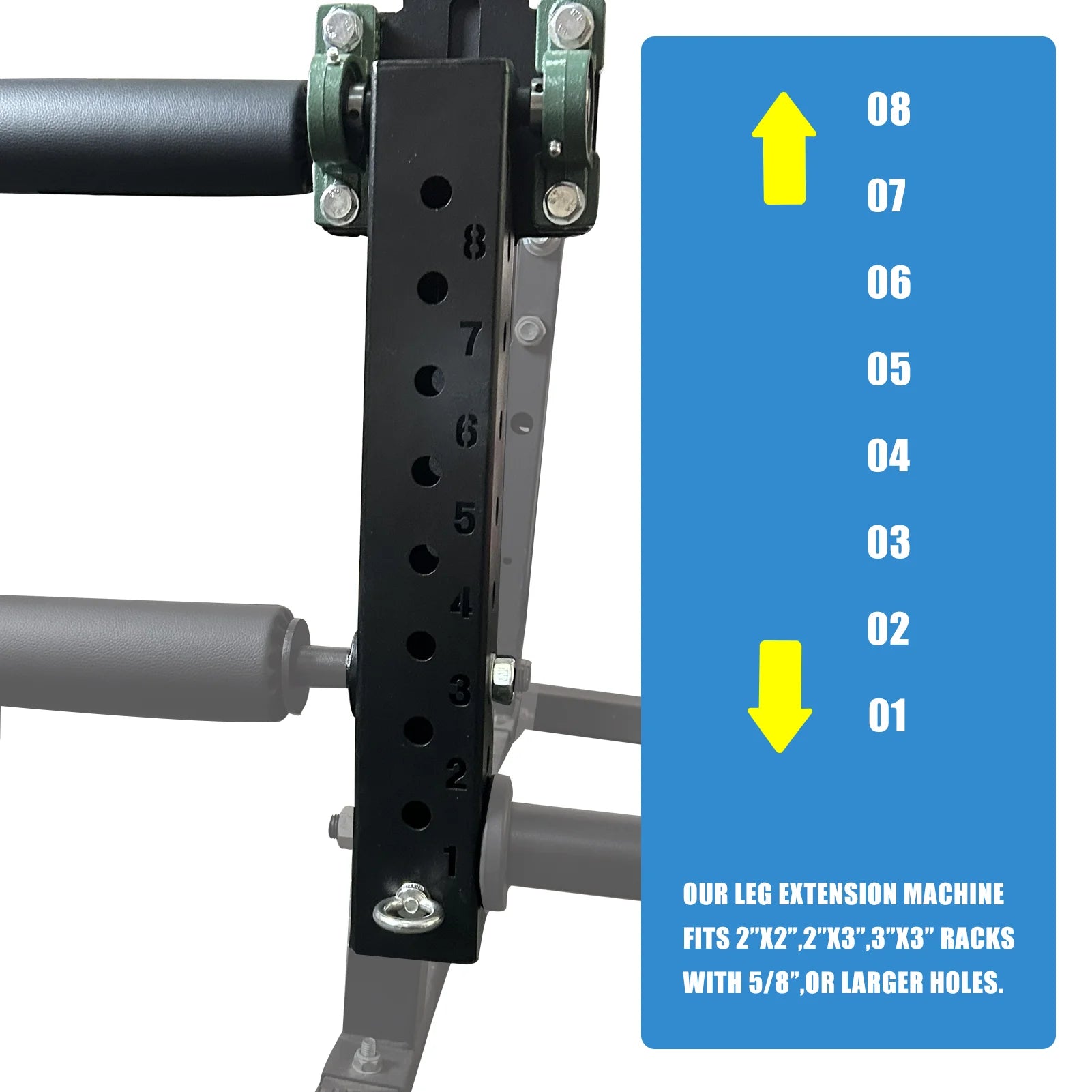 Fit for Different Racks : Our leg extension machine fits 2”x2”,2”x3”,3”x3” racks with 5/8”,or larger holes. The power cage attachment is constructed with heavy-duty solid steel components and utilizes large, thick nuts and bolts for secure attachment.