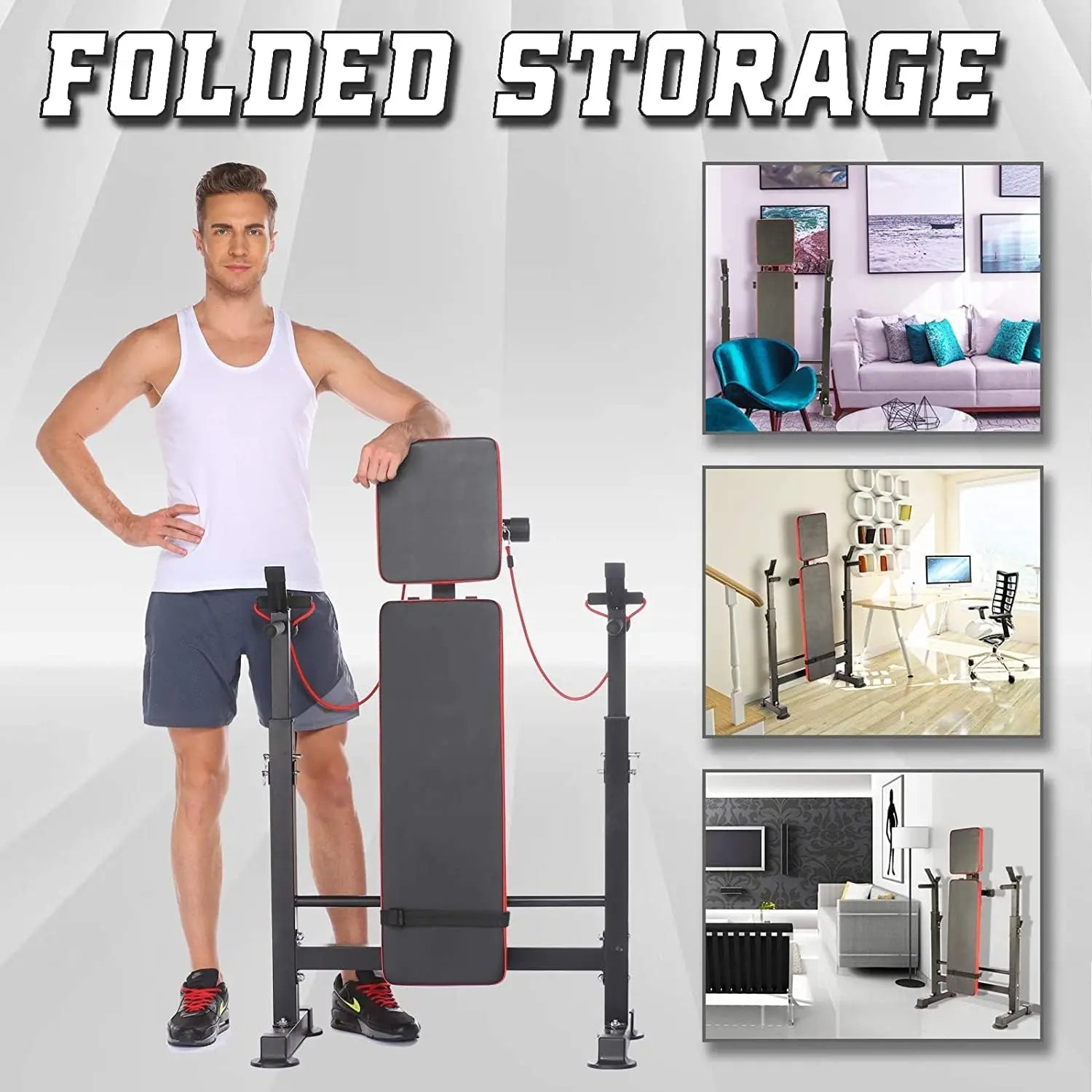 [Foldable & Adjustable]: You can make different adjustments according to your different needs. Backrest adjusts for flat/incline positions. Adjustable uprights can be adjusted to 5 levels. Height adjustable and folded design brings more convenience to your exercising.